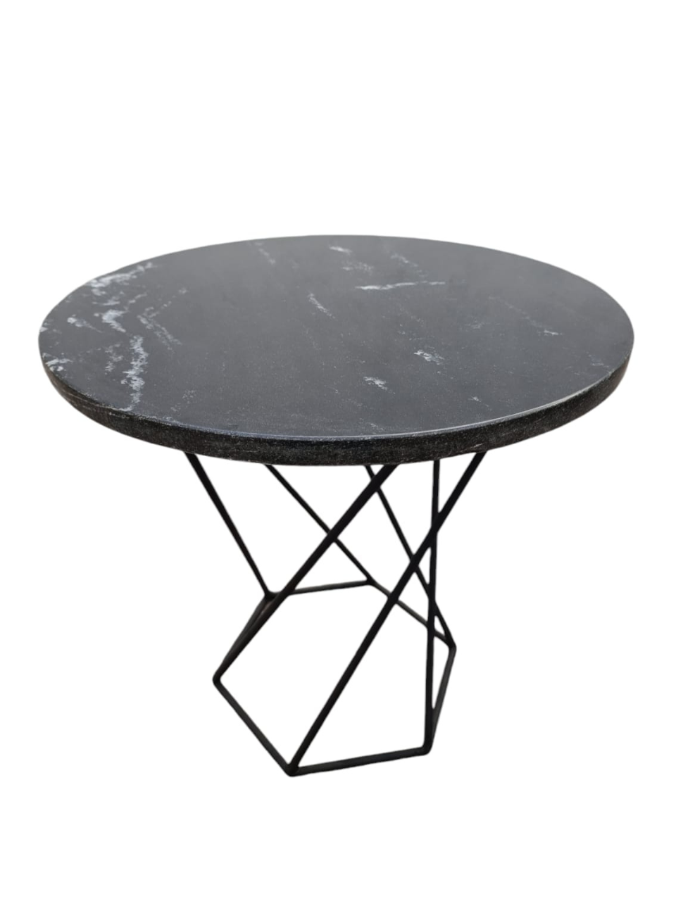 Mesa de mármol negro con base metálica angular, perfecta para espacios modernos.