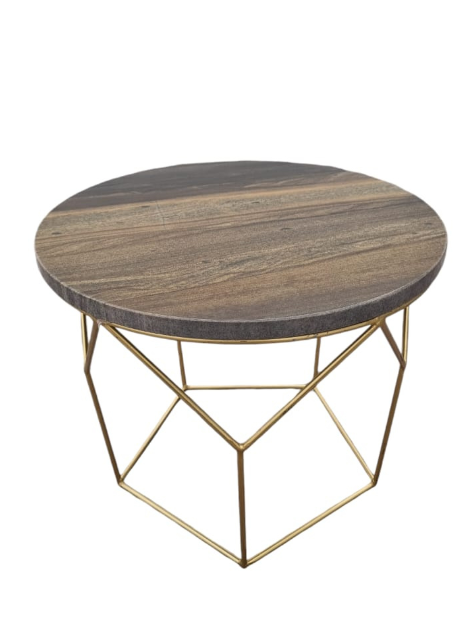 Mesa de mármol con tonos marrones y base dorada, un toque natural y lujoso.